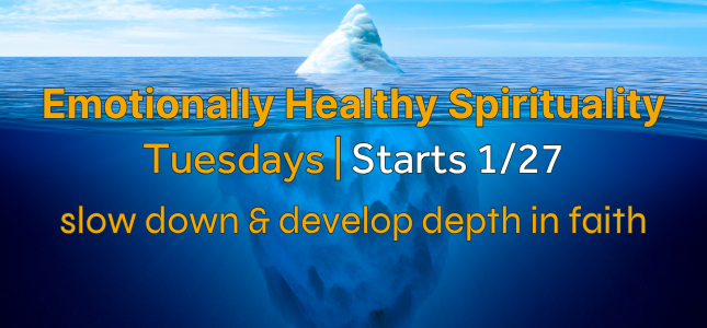 Emotionally Healthy Spirituality Tuesdays, January 27 through March 24, 2026, at Oakdale. 7:00 - 9:00 p.m. Learn how to slow down your life and develop depth in your relationship with Jesus. We will meet at Oakdale in upstairs room 411. Please register below.