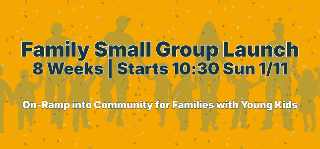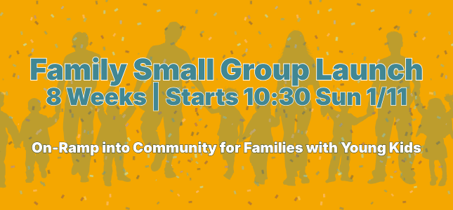 Starting Sunday, January 11, families with preschool and elementary-aged kids are invited to join us for our 8-week Family Small Group Launch! This will be an on-ramp for families looking to build relationships and get connected into an ongoing small group. We will meet at 10:30AM, right after the 9:00AM service, each Sunday. Parents will have space to connect, discuss the Sunday message, and get to know one another. Childcare is provided, and we ask that you please register below to to help us plan.